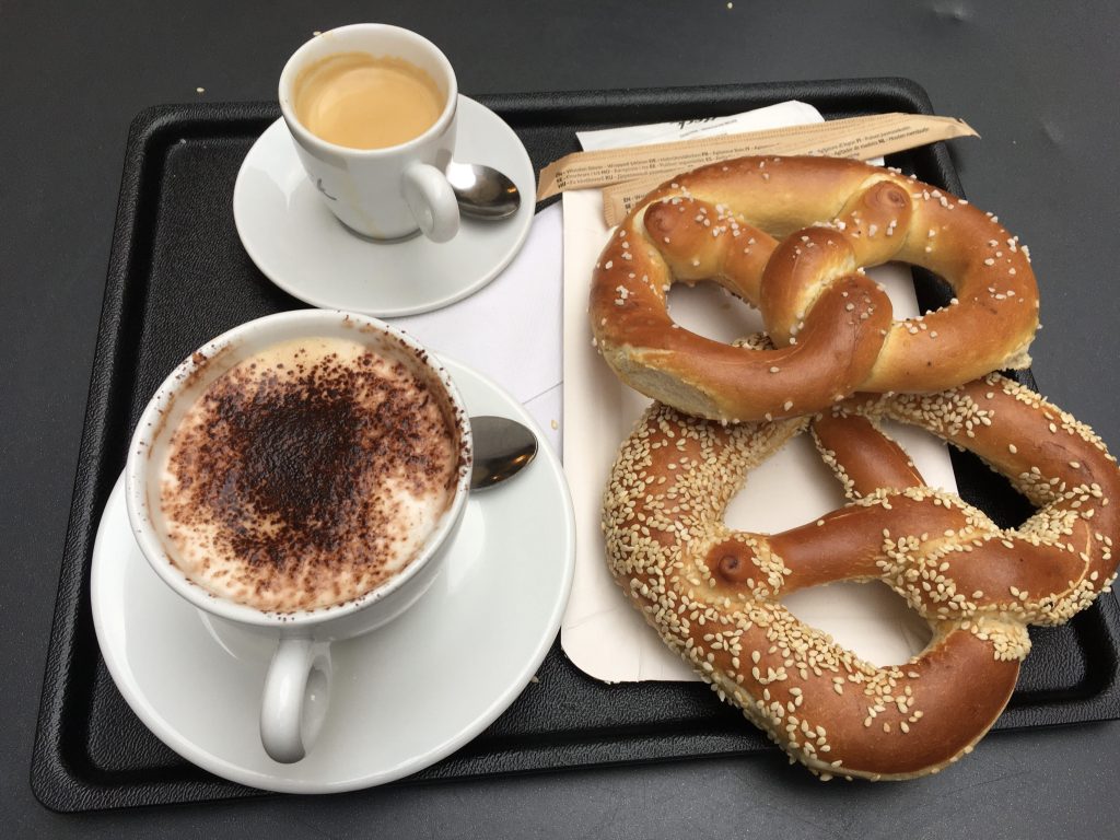 We took a break from walking around at a local cafe and, of course, partook in a delicious pretzel with a hot beverage. Cappuccino for me, espresso for hubby.