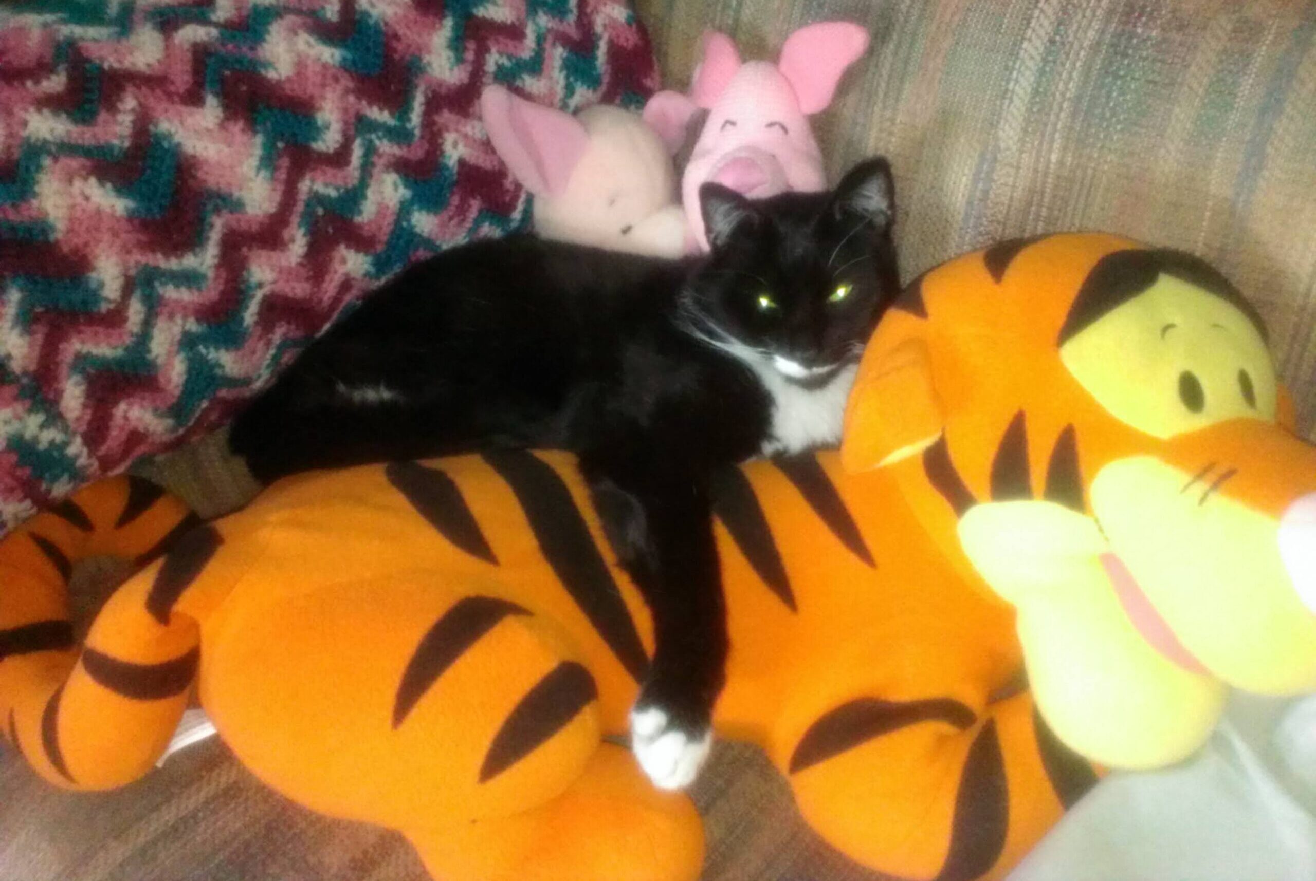 My husband and I came into our marriage with 2 cats each and gave loving homes to multiple ones through the years. Currently, we are the proud owner of 5 purring furballs — Toby (14), Gomez (11), Stewie (10), Pickles (3) and Mowghli (9 months).