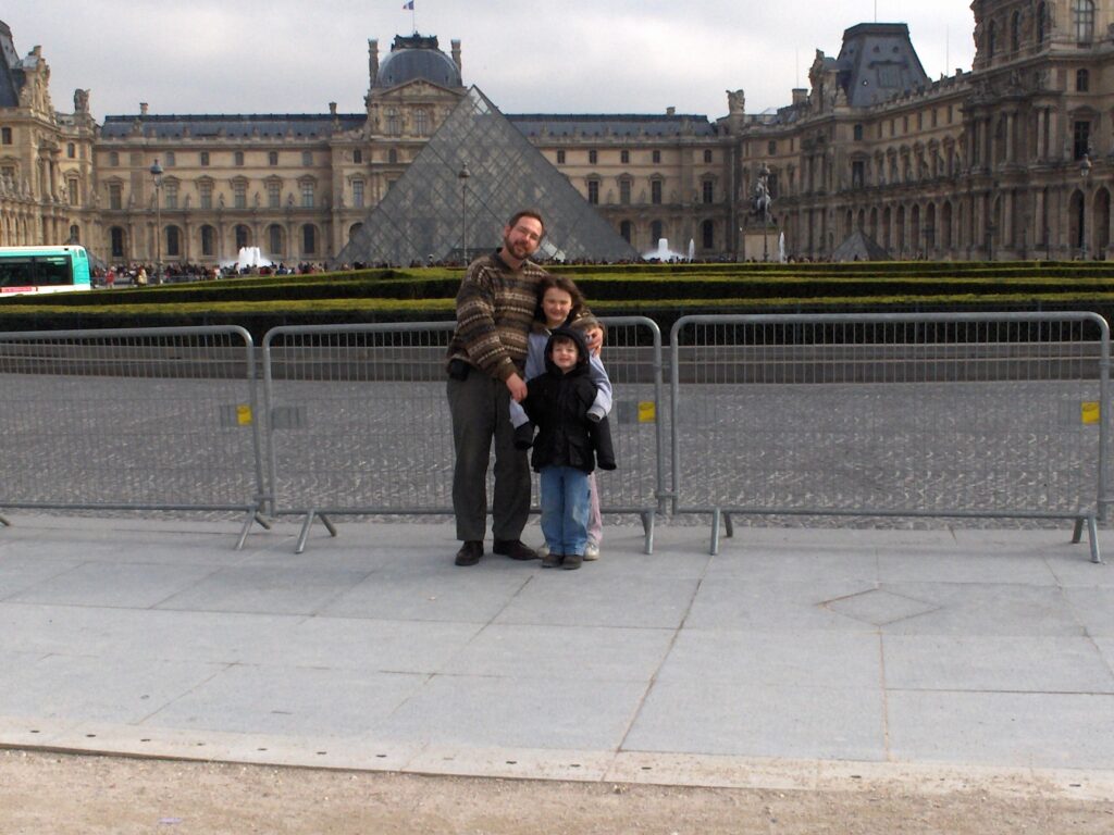 including the Louvre. Famous for housing the Mona Lisa, it contains many other pieces of famous art. The art starts on the outside of this museum as you can see by the pyramid jutting from the ground behind my family.